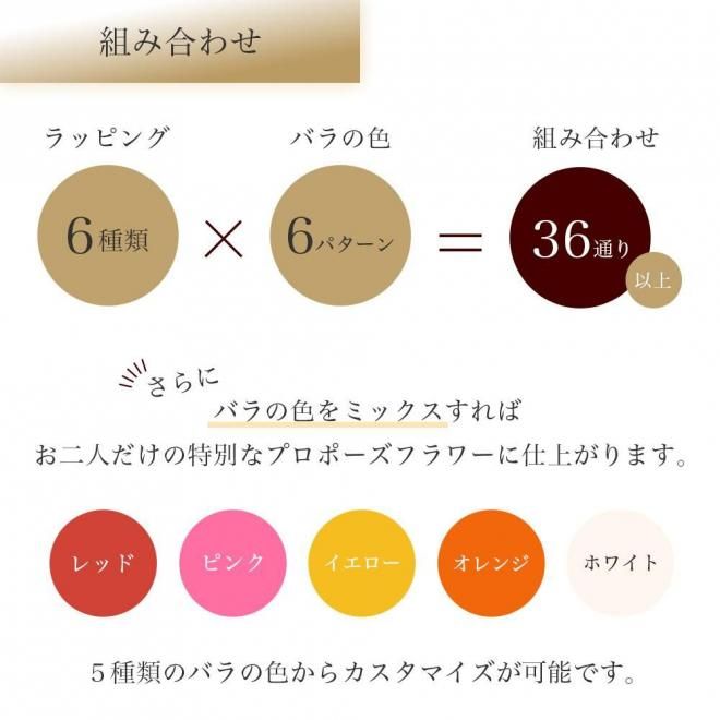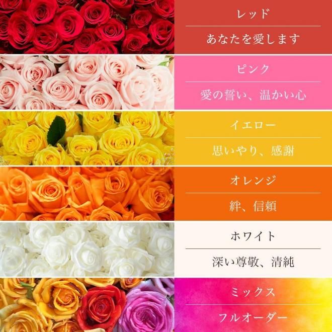 バラの色は赤、白、ピンク、黄色、オレンジ、ミックス(組み合わせ)から選ぶことができます。